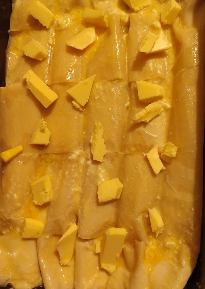 Разгъваме корите и вземаме по три на брой, като всяка мажем с помощта на четка, с по 1 с.л олио. Ще се опитам да обясня как най-лесно става това. Отделяме три кори. Горната намазваме с олиото и обръщаме към долната. Така имаме намазани две кори едновременно. После хващаме двете горни кори, отместваме ги леко настрана и намазваме най-долната (третата). Връщаме двете кори отгоре. Така имаме намазани с мазнина по най-лесния начин три кори. На късата страна на корите, само в единия край, слагаме по 3 -4 лъжици от готовата смес. Завиваме на средно стегнато руло и поставяме в намазнена тава с размер 30×20см.. И така, докато навием всичките кори. Готовите рула намазваме с отделеното яйце, към което сме добавили 1-2 с.л. олио. Нарязваме баницата с нож на равни части и наръсваме с парченца масло …и щипка любов.