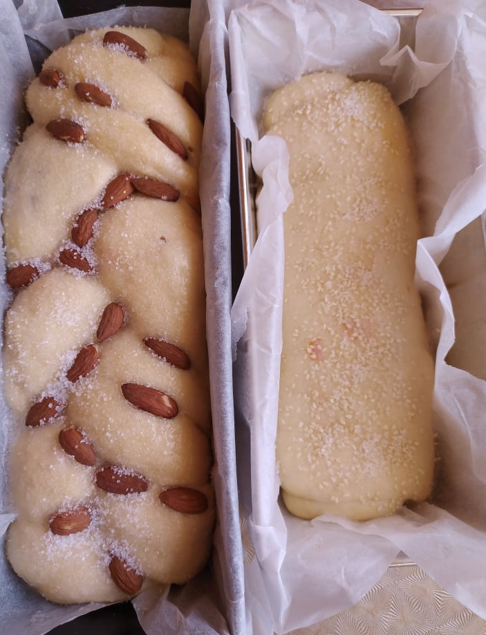 Когато козунакът е достатъчно втасъл, разбиваме отделения белтък с щипка сол и намазваме повърхността му. Поръсваме със захар, бадеми, орехи, сусам (по избор) и печем в предварително загрята фурна на 160* (без вентилатор) за около 50-60 мин. (или до суха клечка).