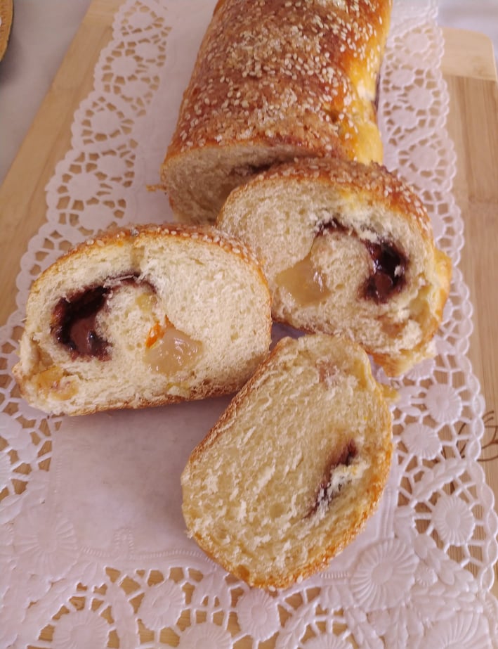 Отделеното тесто разточваме (на леко набрашнена повърхност) на не много тънък правоъгълник. В единия край, по цялата дължина сипвам от течния шоколад, прегъвам тестото (навивам руло), така, че да покрие напълно шоколада и слагам следващата плънка – нарязан на малки парчета локум. Покривам локума с вече навитото руло от шоколад и поставям третата плънка – стафиди. Покривам ги с рулото от шоколад и локум, поставям във форма за печене (покрита с хартия за печене) така, че края на рулото да е отдолу, намазвам с мазнина, покривам със стреч фолио и оставям на топло, да втаса.