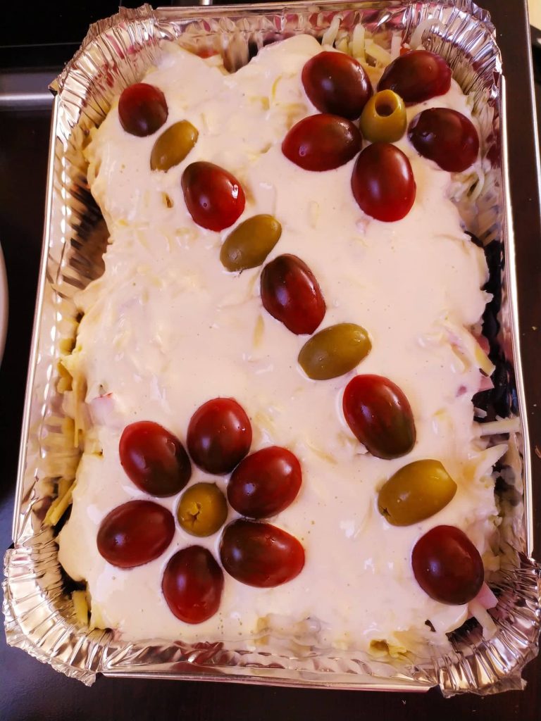 Украсих с няколко нарязани чери-домата и маслини без костилки.