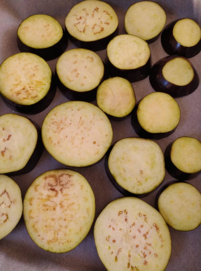 Нарязах патладжаните на колелца с дебелина около 1 см. Накиснах ги в подсолена вода (сипвам около 2-3 с. л. сол) за около 1 час – да се махне горчивия им вкус. След това ги измих хубаво и подсуших върху домакинска хартия. В тавата на фурната застлах лист хартия за печене, върху която наредих колелцата патладжан и ги намазах добре (от двете страни) със смес от олио и зехтин. Изпекох ги в силно загрята фурна с вентилатор за около 20 мин. , до леко покафеняване на повърхността им (на 10 мин. ги обърнах, за да се запекат равномерно и от двете страни).