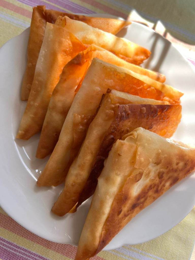 Нагънах като триъгълник и изпържих в горещо олио за около 5-6 мин., като обръщах 1-2 пъти всяка баничка, така, че да се „зачерви“ подобаващо.