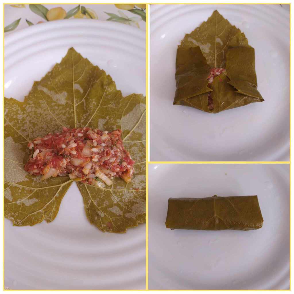 Ако ще ползвам пресни лозови листа, първо ги потапям в съд с вряла вода (попарвам ги) за около 1-2 мин., измивам ги със студена вода и ги поставям в чинийка.