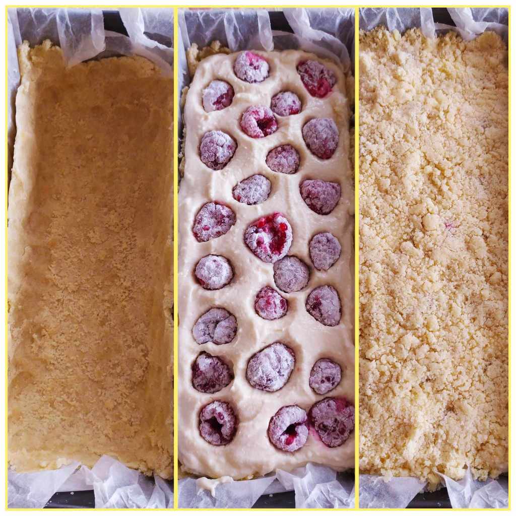 Извадих от хладилника тавичката с разпределеното тесто, подредих на дъното половината от малините, изсипах плънката, подредих отгоре останалите малини, като леко натисках всяка, за да се изравнят с нивото на плънката. Накрая поръсих с останалите маслени трохи, като притисках леко с ръка.